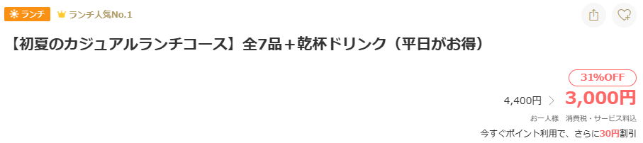 「一休」で予約すると、平日ランチコースなら割引&乾杯ドリンク サービスなので超お得です。
