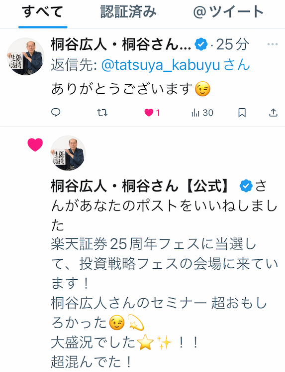 桐谷広人さんの【公式】Xから直接「いいね🧡」とコメントがいただけたので、記念のブログ記事でした!!